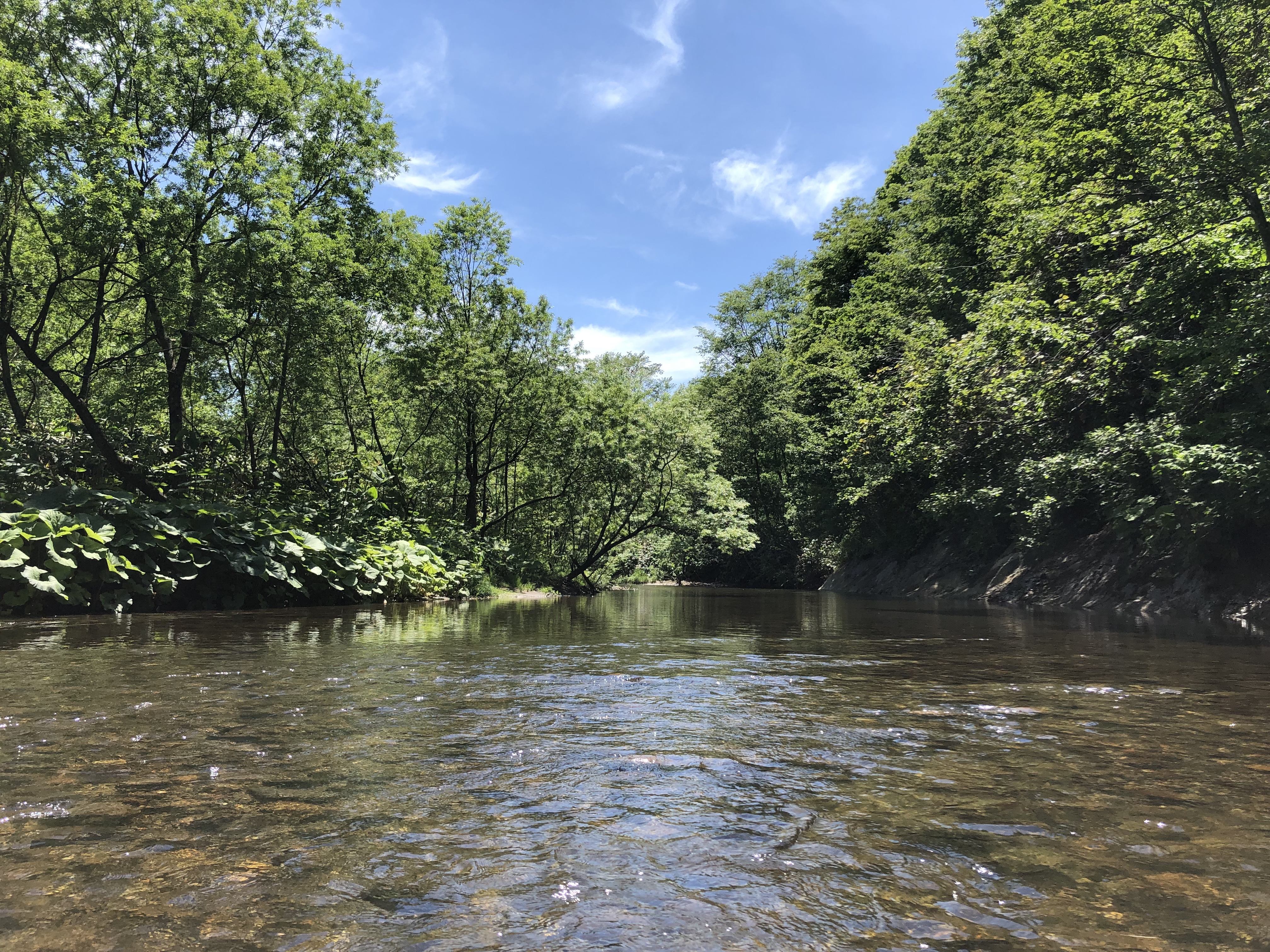 あるがままの自然のなかで、木々の緑と空の青を映す渓。