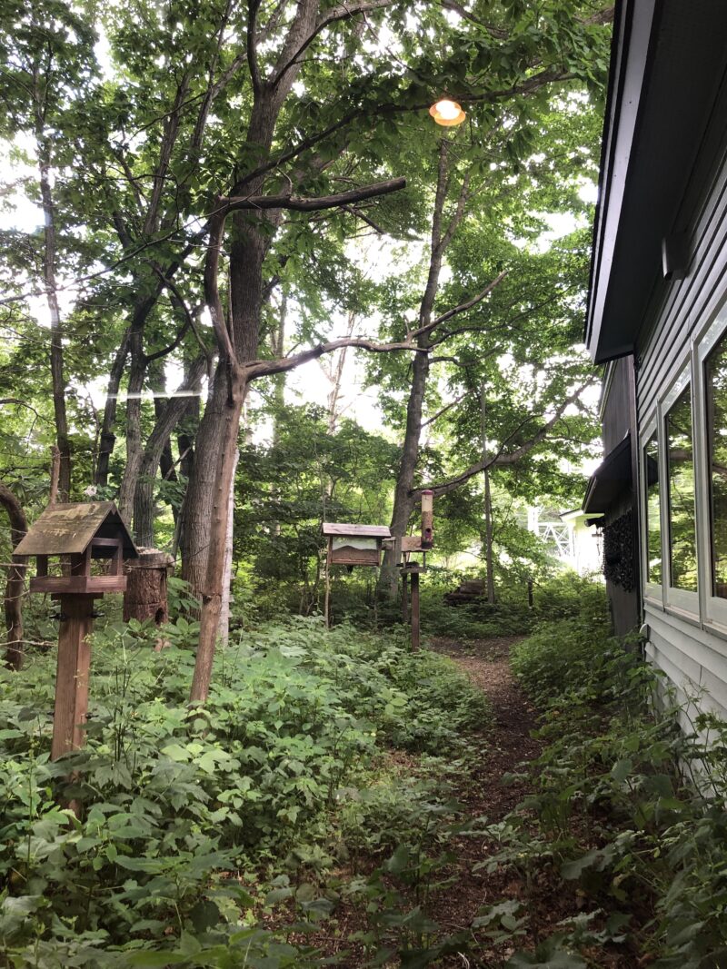 餌台のある森が見えます。